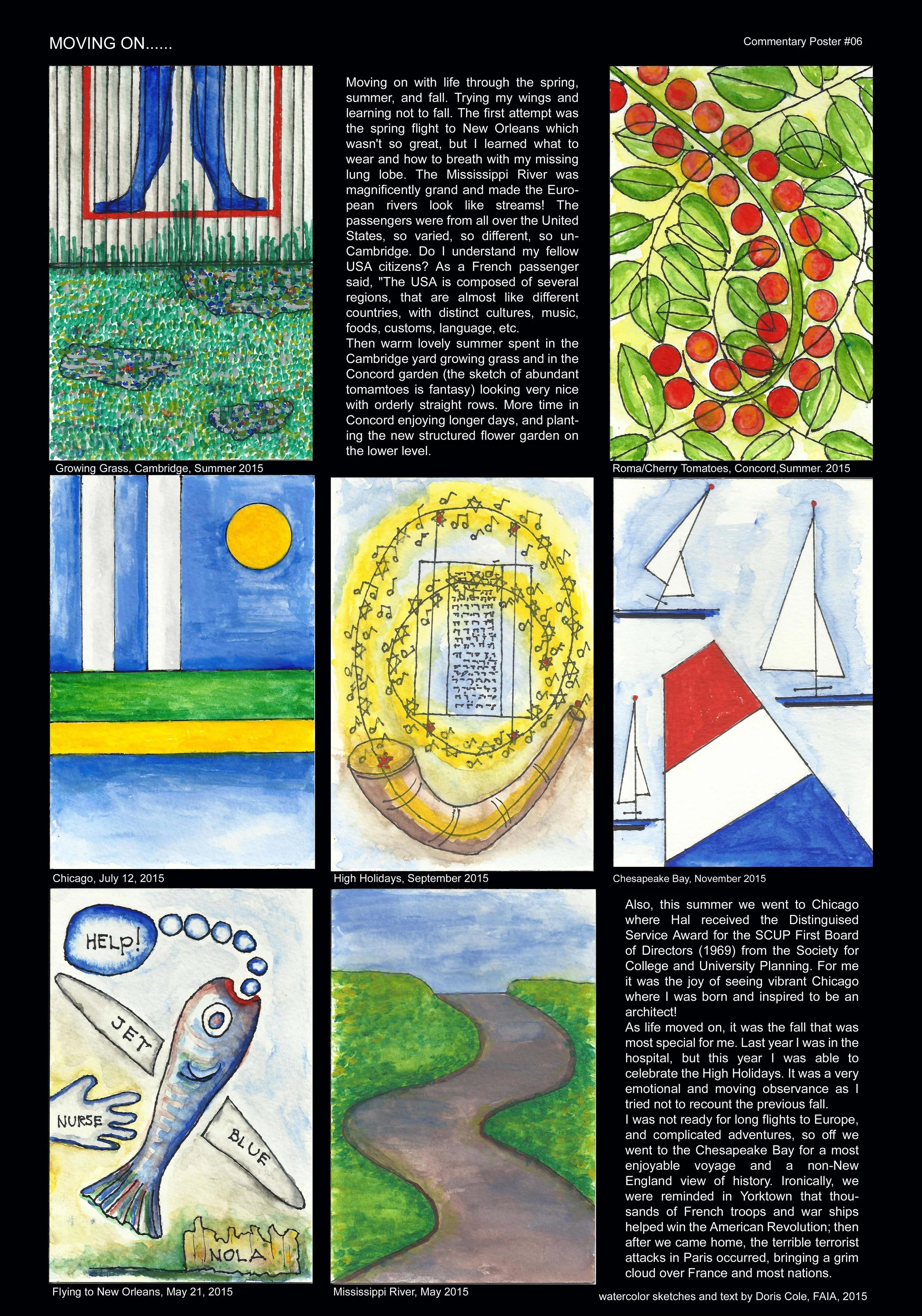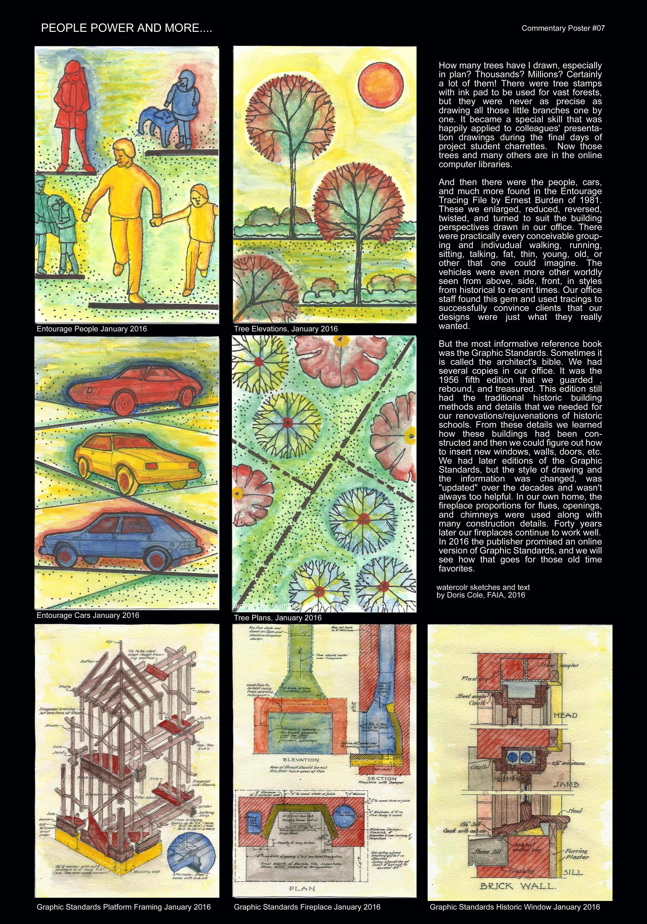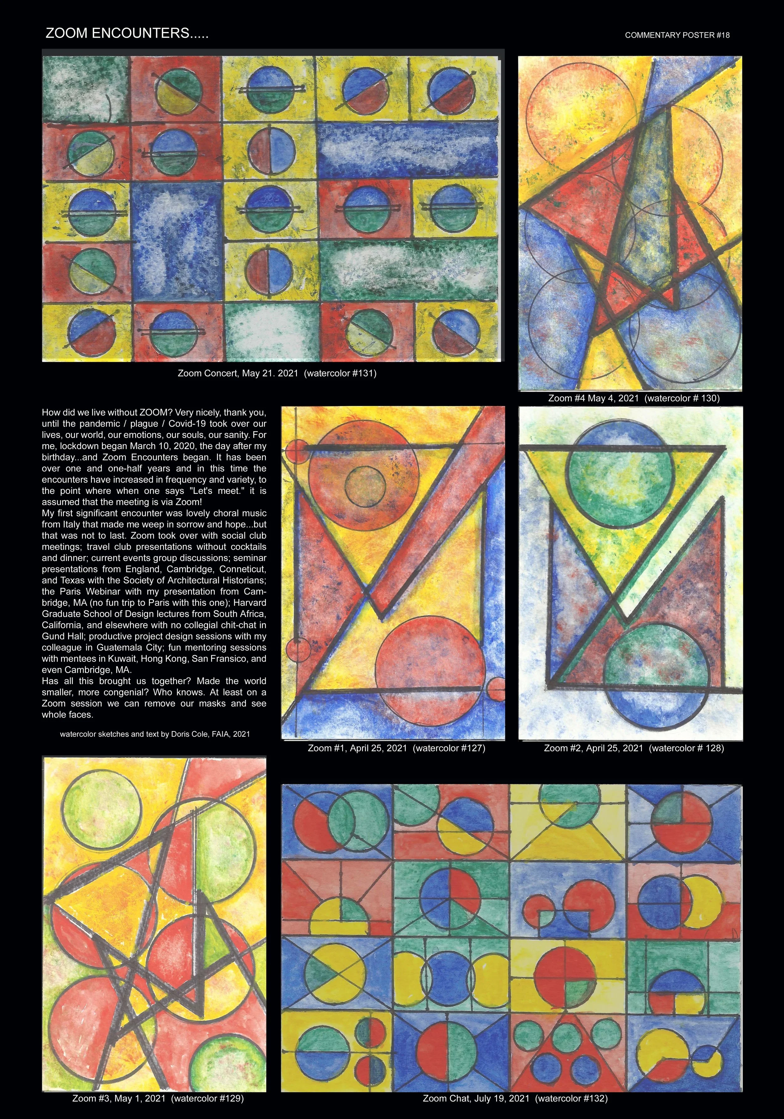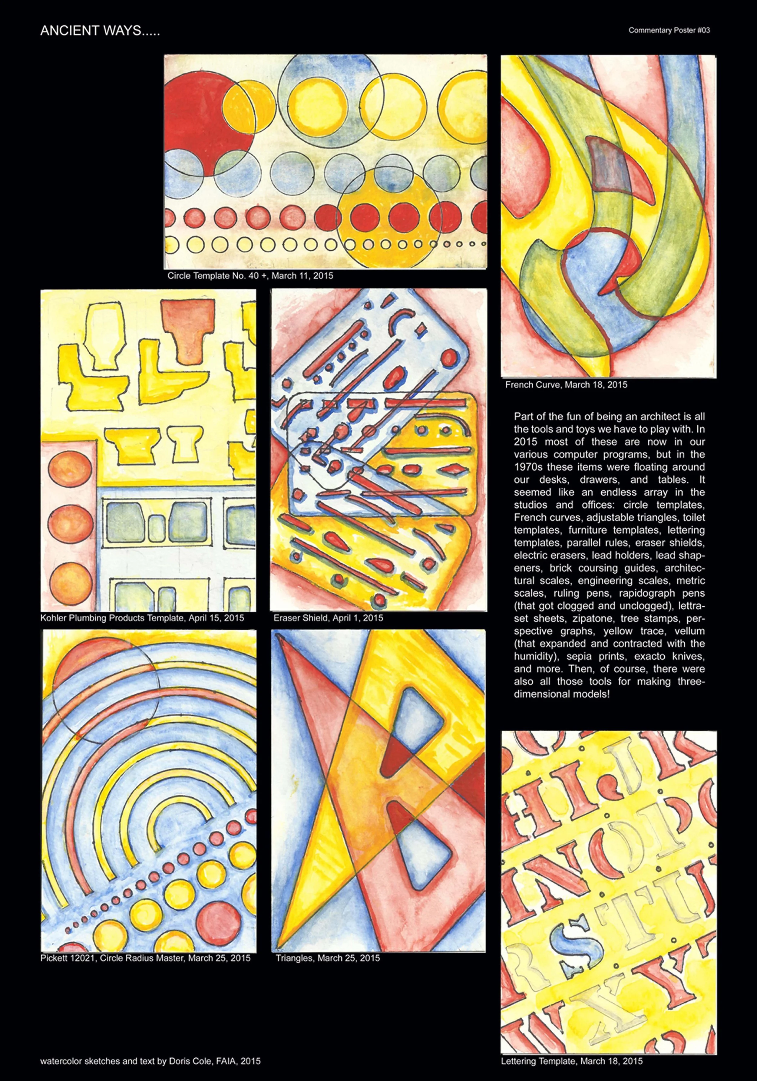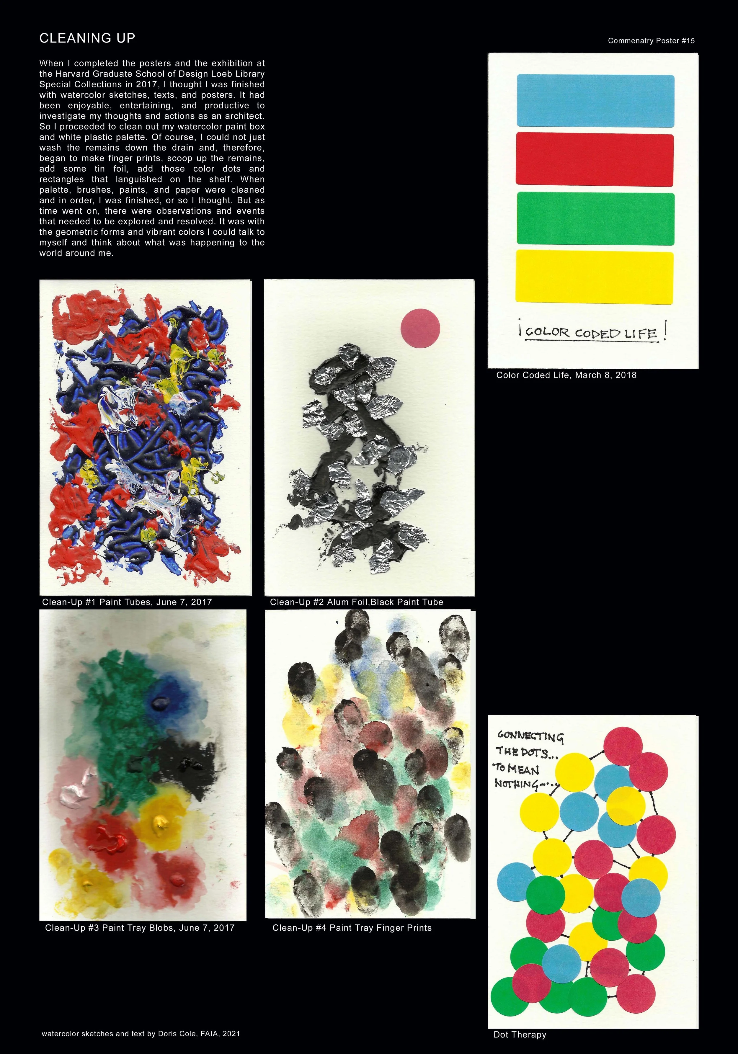 During many years of practice Doris has been considering questions from clients, students, colleagues, and herself. These commentary posters are her response to questions asked about her life as an architect. The posters consist of exploratory text and small abstract watercolors that are scanned, combined, and enlarged in the computer. They are about architecture and related matters relevant to the past, present, and future of an architect. These posters represent the thoughts and experiences of one architect, Doris Cole. However, this one architect represents the many seeking to practice architecture and to understand the world around them. The very nature of these posters, combining the hand-made and machine-made, represents the constant challenge of architecture.